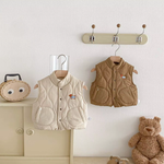 The vest features a stylish quilted texture, a stand-up collar for added warmth, and easy snap buttons for quick dressing. Adorable embroidered details add a playful touch, making it both practical and cute. Available in two neutral colors: cream and brown, perfect for matching any outfit.